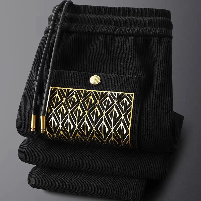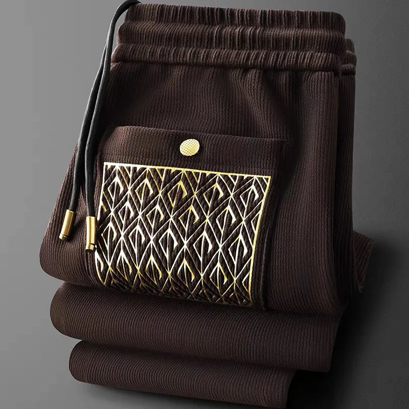 Not your average trousers—these are a statement in motion. Crafted from a signature cotton blend with a ribbed texture and gold-thread detailing, they offer all-day comfort with standout style. Whether you're jet-setting, unwinding, or stepping out, these trousers move with you and turn heads while doing it.